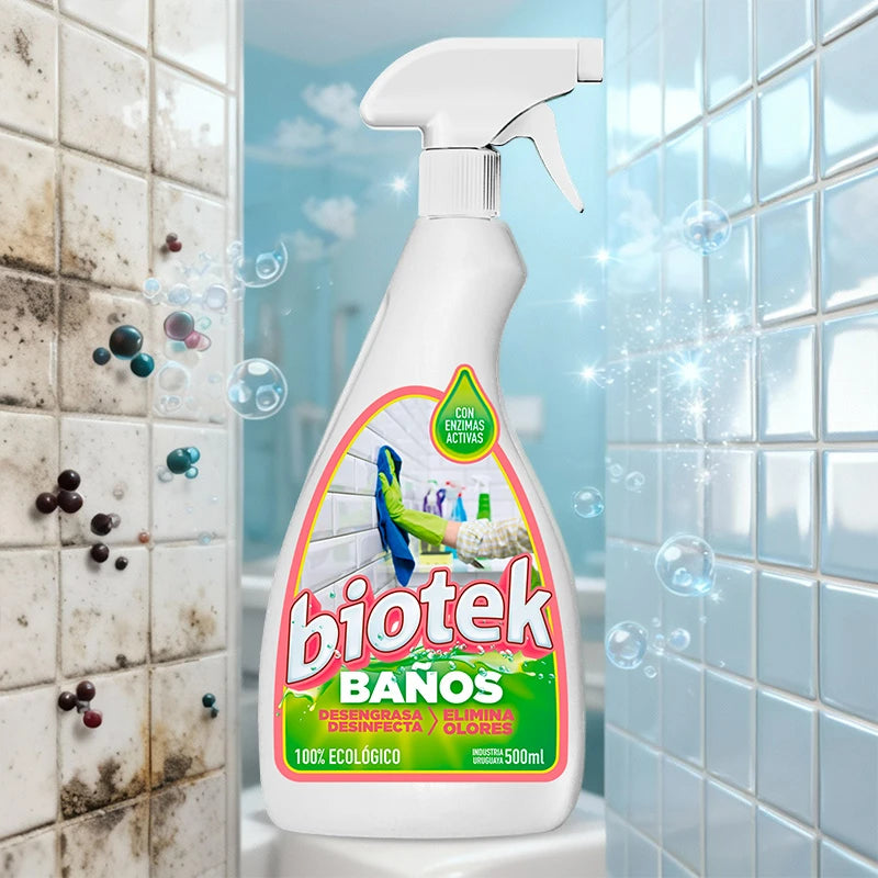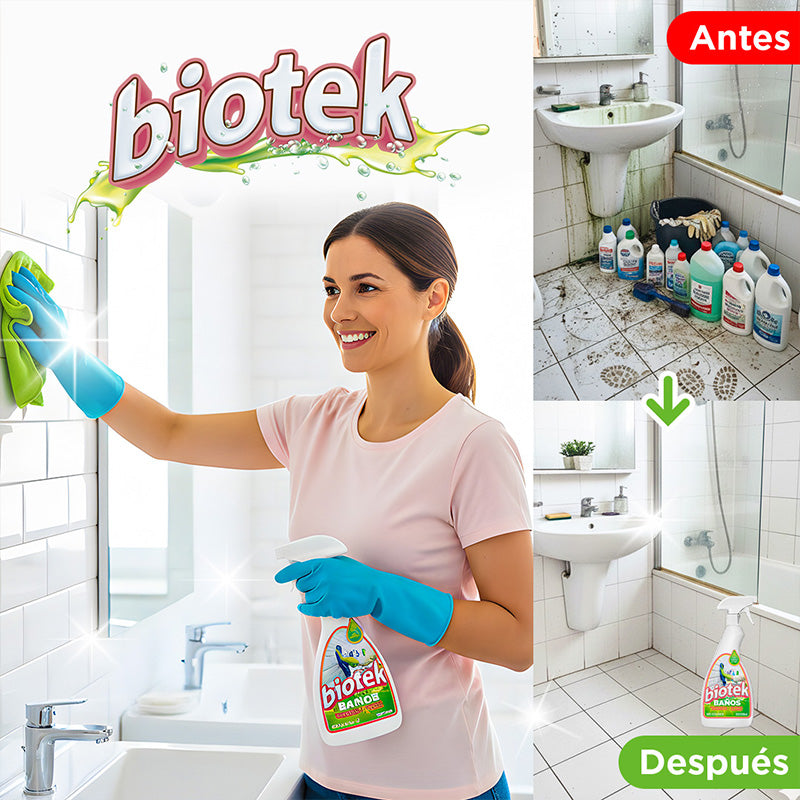 Biotek Baño: Desinfecta, elimina grasa, limpia azulejos, duchas y sanitarios, e incluso purifica el aire.